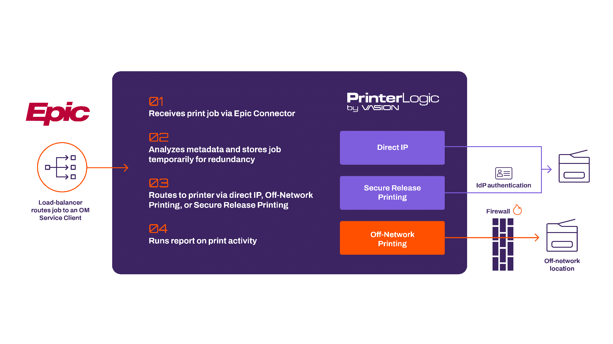 The PrinterLogic Epic Connector reroutes print jobs so that, rather than flowing through a web of disconnected servers and drivers, it’s directed through PrinterLogic to the destination printers. The PrinterLogic Admin Console then becomes “mission control,” enabling you to manage the various servers, drivers, and queues across both Epic and clinical printing without the need for third-party equipment or services.